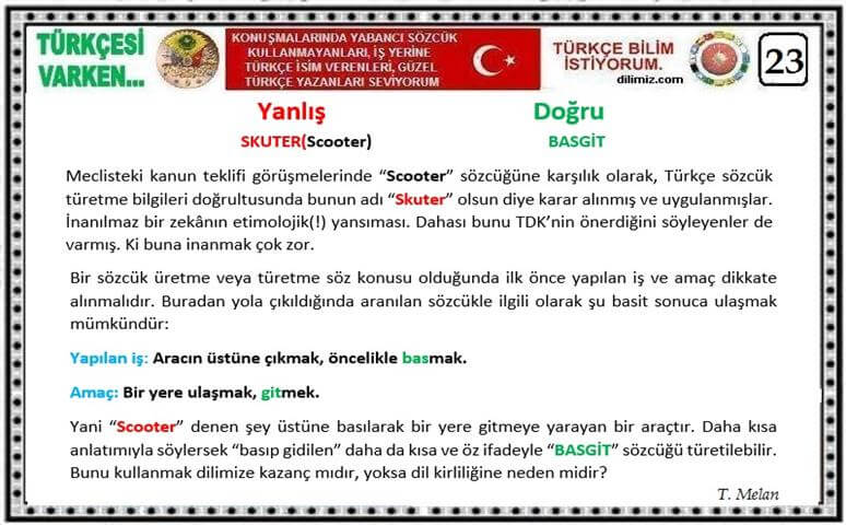 Yani “Scooter” denen şey üstüne basılarak bir yere gitmeye yarayan bir araçtır. Daha kısa anlatımıyla söylersek “basıp gidilen” daha da kısa ve öz ifadeyle “BASGİT” sözcüğü türetilebilir. Bunu kullanmak dilimize kazanç mıdır, yoksa dil kirliliğine neden midir?